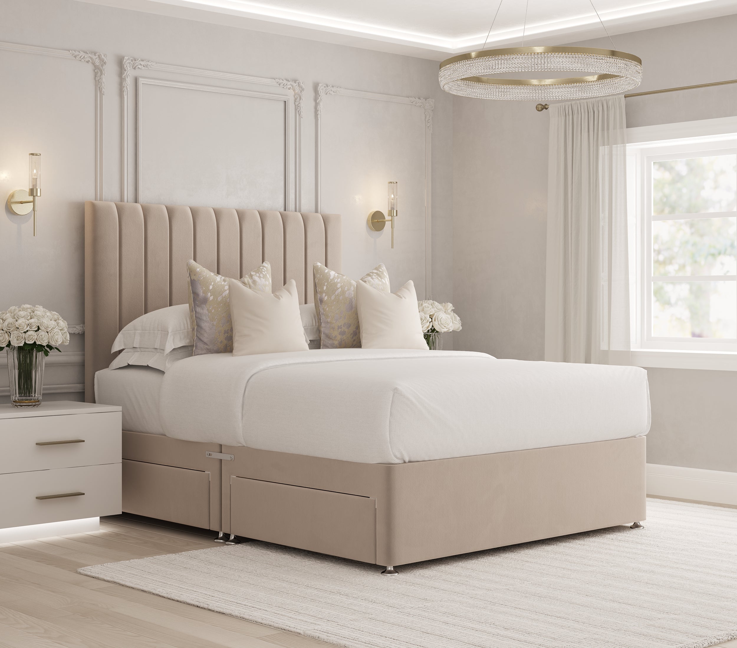 The Athens Divan Bed combines elegant design with versatile storage options to suit any bedroom. Choose from models featuring two or four spacious drawers or opt for a sleek, no-storage style. Its striking 54" Floor standing headboard is beautifully crafted to create a refined focal point, while a selection of over 20 sumptuous fabric colors allows you to tailor the bed to your personal aesthetic. Experience a blend of functionality and sophisticated style that complements any interior.