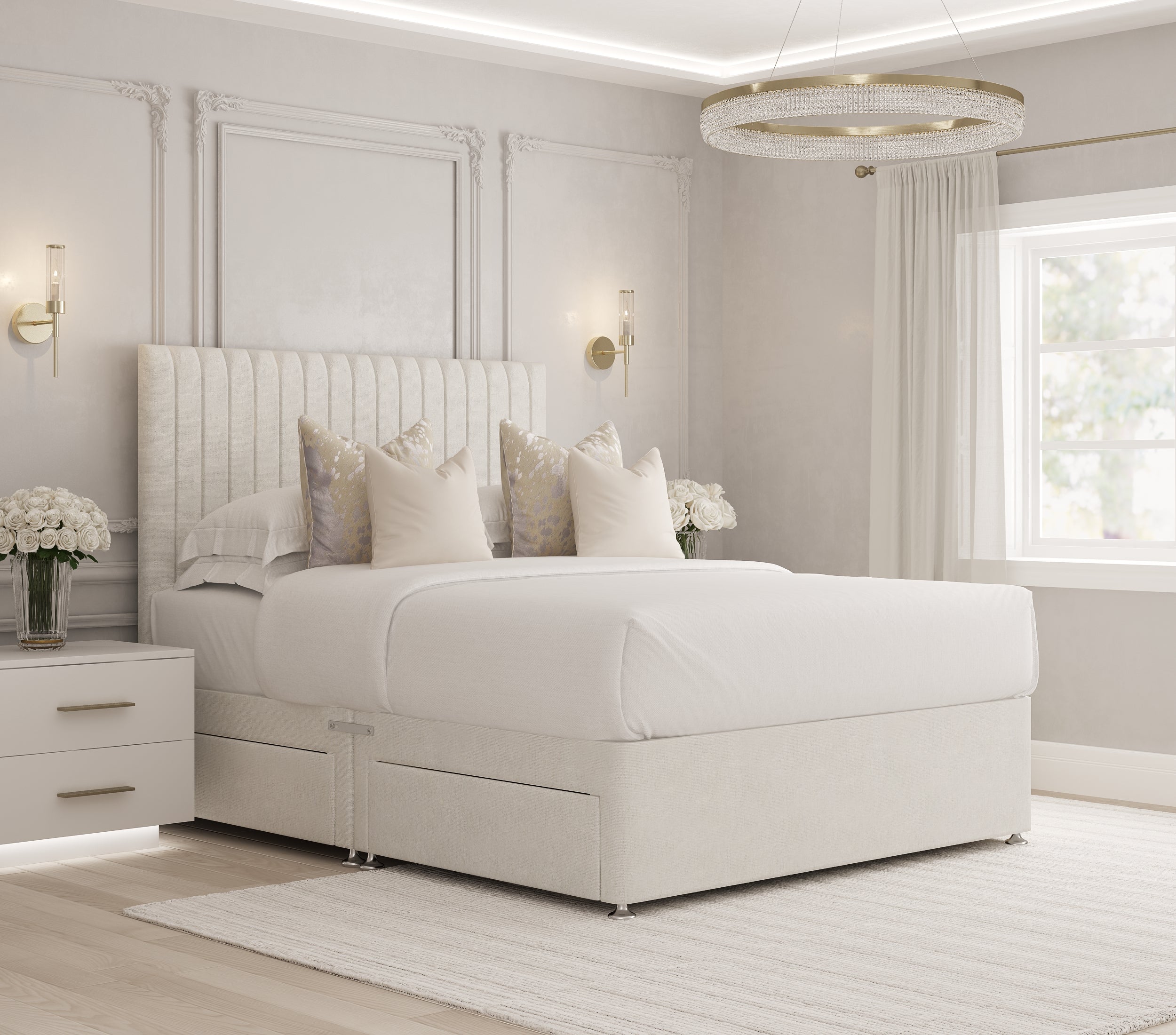 The Carlo Divan Bed combines elegant design with versatile storage options to suit any bedroom. Choose from models featuring two or four spacious drawers or opt for a sleek, no-storage style. Its striking 54" Floor standing headboard is beautifully crafted to create a refined focal point, while a selection of over 20 sumptuous fabric colors allows you to tailor the bed to your personal aesthetic. Experience a blend of functionality and sophisticated style that complements any interior.